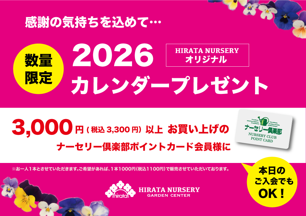 お待たせいたしました!!2026年平田ナーセリーオリジナルカレンダーのプレゼントキャンペーンがスタートいたします。