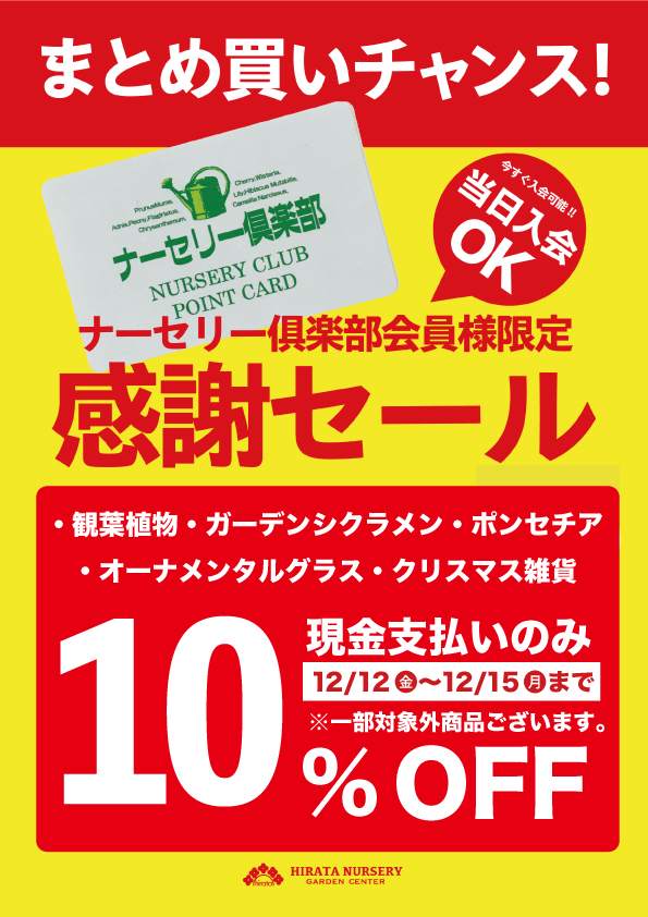 平田ナーセリーのポイントカード「ナーセリー俱楽部」カード会員様限定の歳末セールを開催いたします。