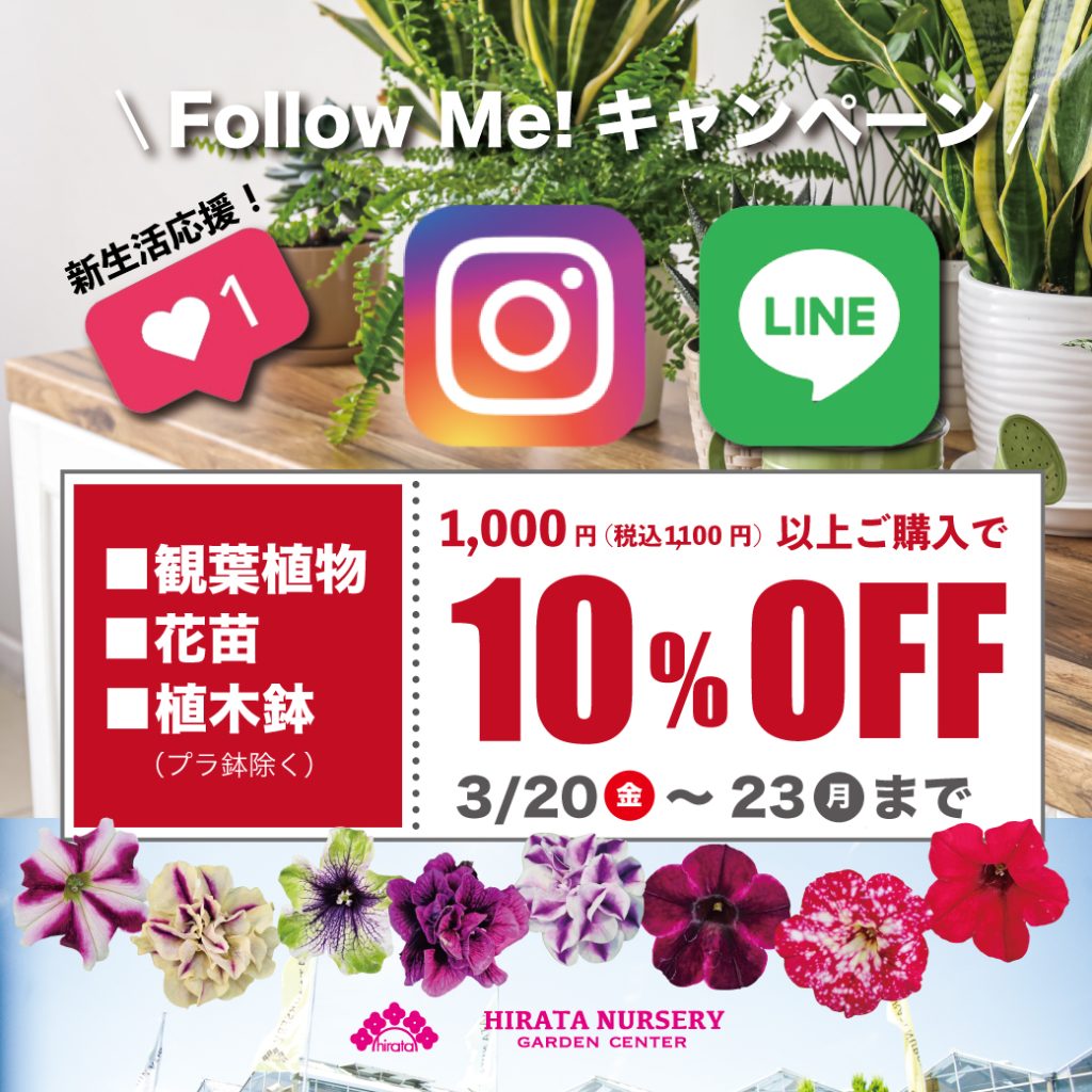 ナーセリー俱楽部ポイントカードをお持ちの会員様で各店舗のインスタグラム・公式LINE@をフォローして頂いている方は1,000円(税込1,100円)以上のお買い物で対象商品の【花苗】【観葉植物】【植木鉢(プラ製を除く)】が10%OFFとなります。