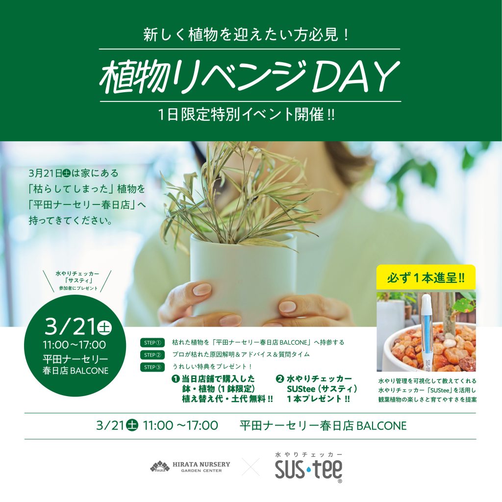 3月21日(土)は「植物リベンジDAY」として、平田ナーセリー春日店BALCONEにて植物の植え替えイベントを開催いたします。