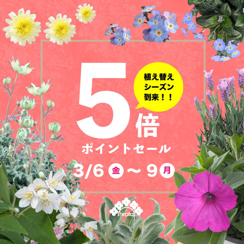 3月6日(金)~3月9日(月)までの期間限定で【ナーセリー俱楽部カード5倍ポイントセール】を開催いたします!ナーセリー倶楽部ポイントカード会員様は、通常お買い上げ100円(税込110円)毎に1ポイント付与のところ、期間中はなんと!5ポイント付与致します。